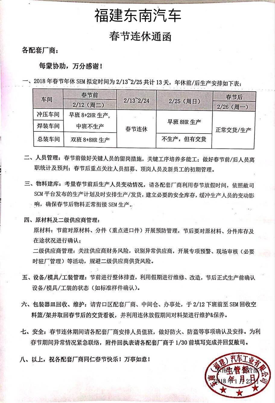 東南汽車春節連休通函